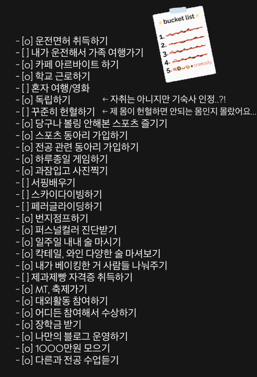 진짜 졸업이구나 싶어 20살 새내기 시절 적어두었던 버킷리스트 메모장을 꺼내 보았다.